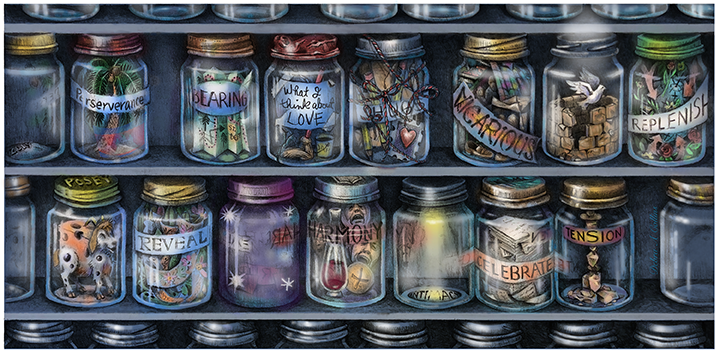 The biannual Artists & Writer’s Retreat, held at Saint Dorothy’s Retreat in California, inspired this piece. This retreat has be an on going event for over eighteen years. It was the second time I participated with this group. I enjoyed their company and the scheduled sharing of our works. One of retreat’s traditions is a haiku challenge. Everyone, writers and artists, can choose to take it on, or not. Generally, there is a theme. This year it was food. My drawing is an illustration of my haiku. It’s about the participants of this year’s retreat who sat at long tables during meals. Each bottle represents something an artist or writer shared during the retreat.