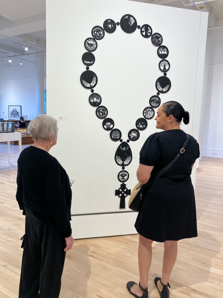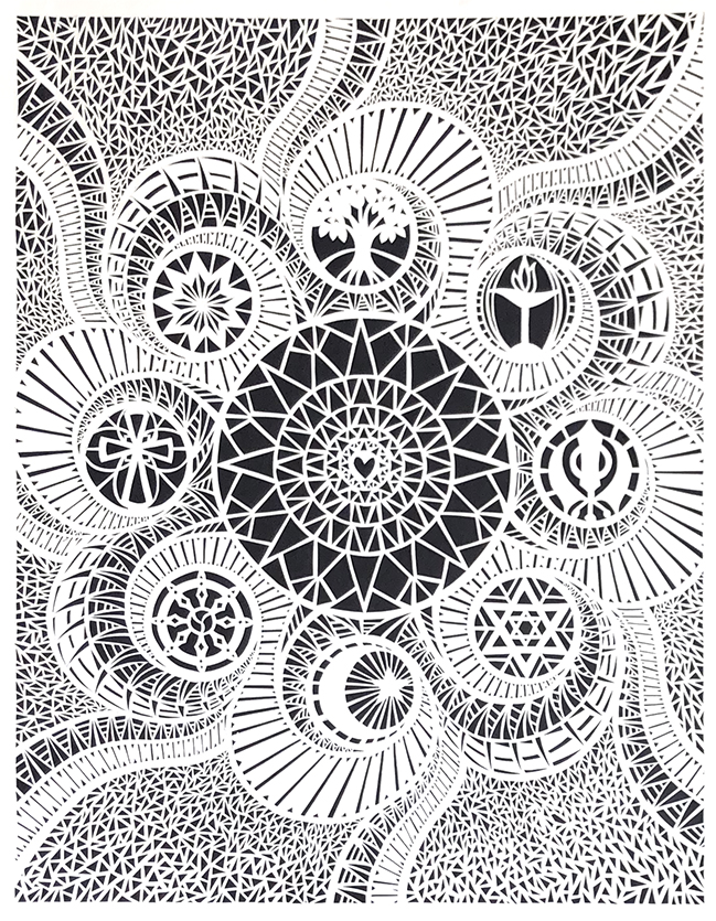 Have Mercy was created during the early days of Trump’s second term, a period marked by sweeping changes that profoundly affected marginalized groups— the poor, trans Americans, our immigrant communities, as well as the environment, social services, and government agencies. Reverend Budde’s compassionate sermon, pleading for mercy, deeply moved me and inspired this large, rosary papercut. I completed the piece just before Lent began and felt honored when my church chose to display it in the sanctuary.