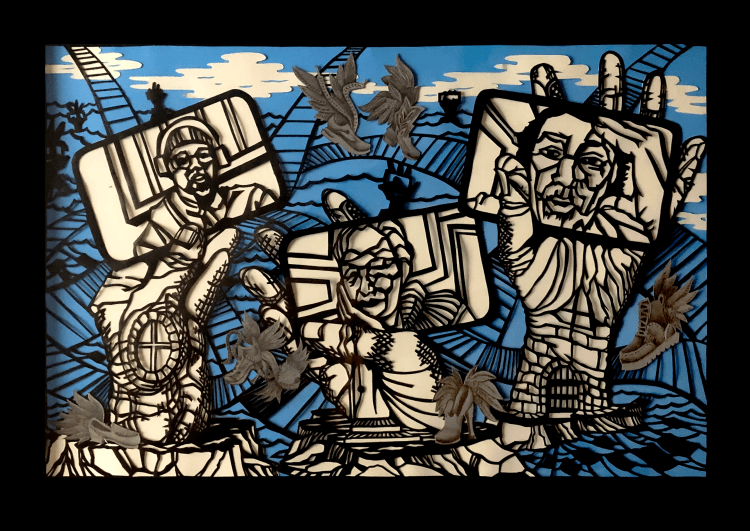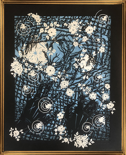 As a member of the Guild of American Papercutters, I was offered the opportunity to show a paper cut at the Laurel Arts Gallery in Somerset, Pennsylvania. The prompt for the show was “building bridges.” Created during the shutdown of the covid pandemic, My Covid Dream, coveys my frustrations and blessings during this surreal time. Stuck within our island homes and using electronic devices to bridge the distance between my family and friends, I swayed between being a prisoner and wandering the world virtually. I could only “hold” my loved ones via screens. Yet, I made new connections via social media. I now connect with other artist in Japan, Croatia, and Italy just to name a few. The little shoes with wings represent our collective desire to escape and meet up. If you look closely, you’ll see a pair of shoes touching, bridging the quarantine divide.