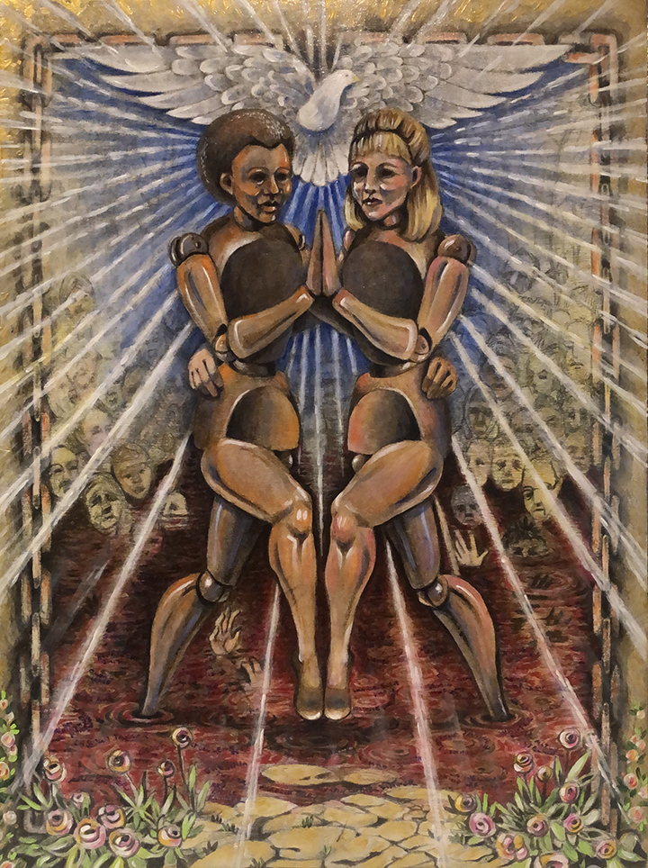 This was also created for the Trinity show in Sacramento. I was still working with the show’s theme of Lord restoring health and healing wounds. I kept thinking about the veil that separates this world and the next. How the times we’re living through makes that veil so thin. People are scared and feeling like their hanging from a thread. Yet, when we can pull our attention away from the fray, we see so many people working to support their communities and reach out to their neighbors around the world. God is present there. So I added old time, five petal roses, a symbol for Christ used in traditional icon paintings. The roses are breaking through the veil. The dove, a symbol for the Holy Spirit that is not limited to our sense of time and space, was added too. The roses and the doves move beyond the “frame” convey a sense that this too will pass and all will be well.