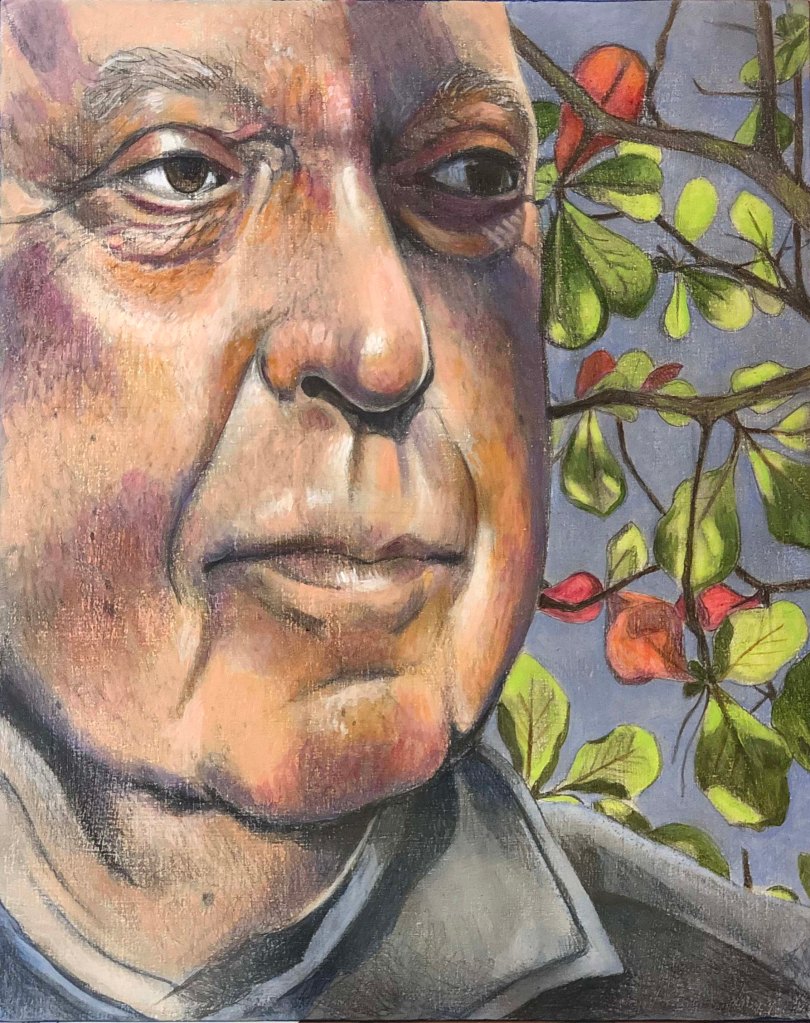 Two years ago I made a bet with my brother about the seeds we were planting in our summer garden. Would old seeds sprout? I had my doubts. However, my brother’s optimism won out. What did I owe him? A portrait. Well, life got in the way. He patiently waited. Finally on a sunny, winter day, I took a pic and two weeks later his face appeared on my gessoed board.