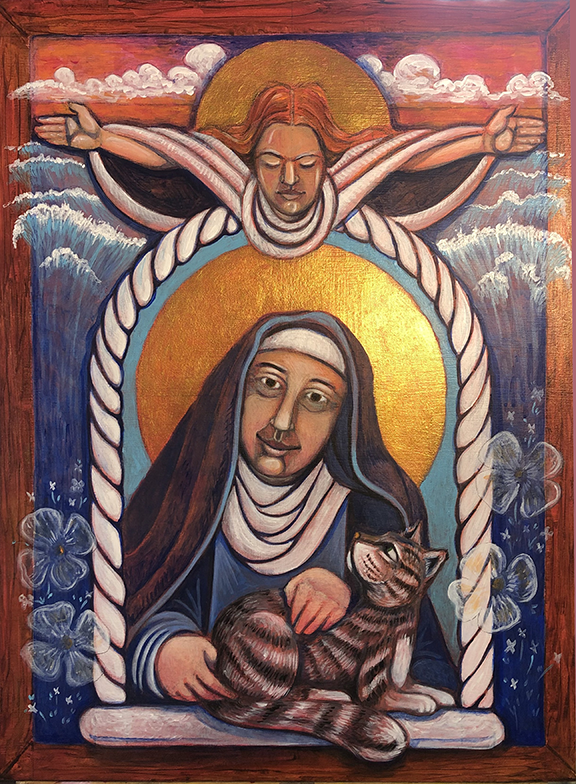 Painting the patron saint of contemplatives and cats was an absolute joy. Perhaps it’s because her comforting words, “All will be well, all manner of things will be well,” bring such reassurance. Traditionally, icons depict holy figures with neutral expressions, the idea being that viewers can take from the image whatever they need. However, given her message, how could I possibly paint her with anything but a smiling face? Even her cat gazes at her radiant expression, finding solace in her joy.