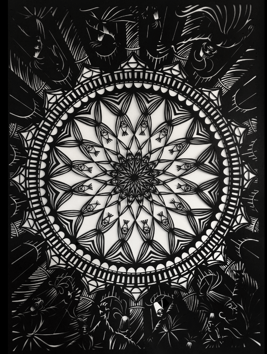 Paper cuts are such a cool thing to create. When I tell people that I drew and cut the image by hand, awe sets in. I find the process very meditative. I slow down and focus on making precise cuts and watching, that as I turn rotate and move the paper, that it doesn’t tear. Paper is tougher than you think. It is a lesson learned as you fight to cut tiny corners and paper resists the knife. I find it magical, that as I cut away the stiff paper, what remain starts to feel and move like airy, thin silk fabric.