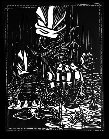 This is a papercut done in collaboration with composer Mary Fineman. Both of us are members of The National League of American Pen Women. It is America’s oldest, women’s professional organization. Our yearly chapter art show will in January. Mary suggested that some of our artists might use her lyrics as inspiration. I definitely was. Mary’s song Everyday Secrets is about not to following the constraints of culture. Instead it suggests you should follow your own bliss. The impetus of the change was being in nature and touching a dragonfly.
