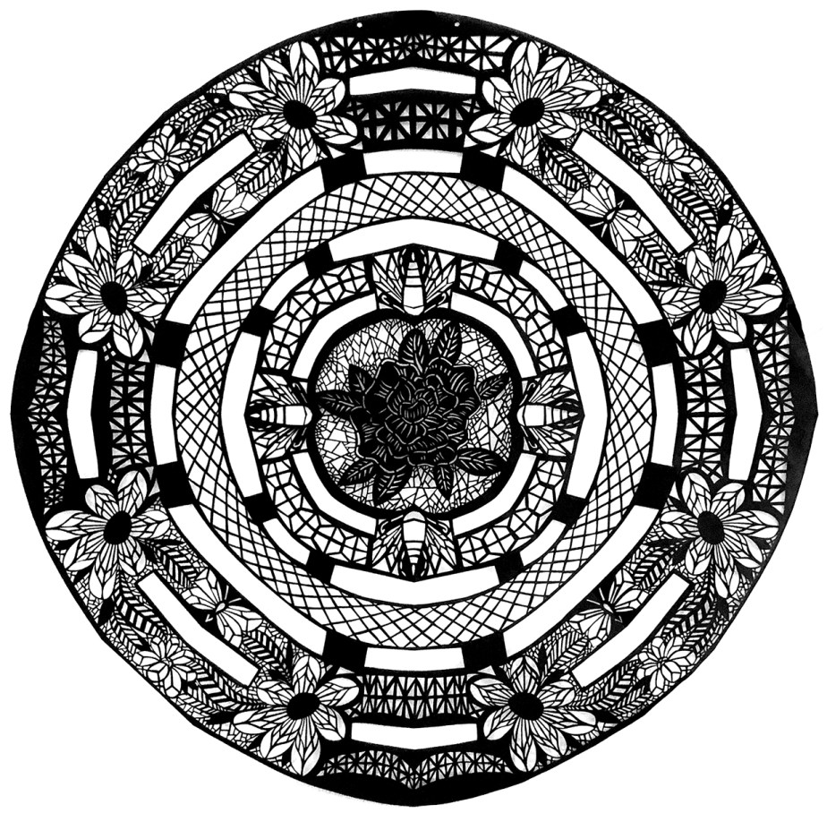 Looking in her studio for paper to use, she salvaged a round piece of butcher paper. She folded it as if she was going to cut a giant snowflake. First she cut away large shapes. Then she unfold it and started drawing elements that make up this garden, mandala design. Debra was trying to see how far she could push the material without out it sagging and misshaping. She also found that spray painting the paper black hid all her sketch lines, so much easier than erasing.