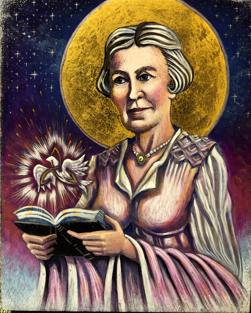 Above them is the dove, the symbol of the Holy Spirit , that proceeds from the Father and energizes the work of all the saints that work towards making life better for all.